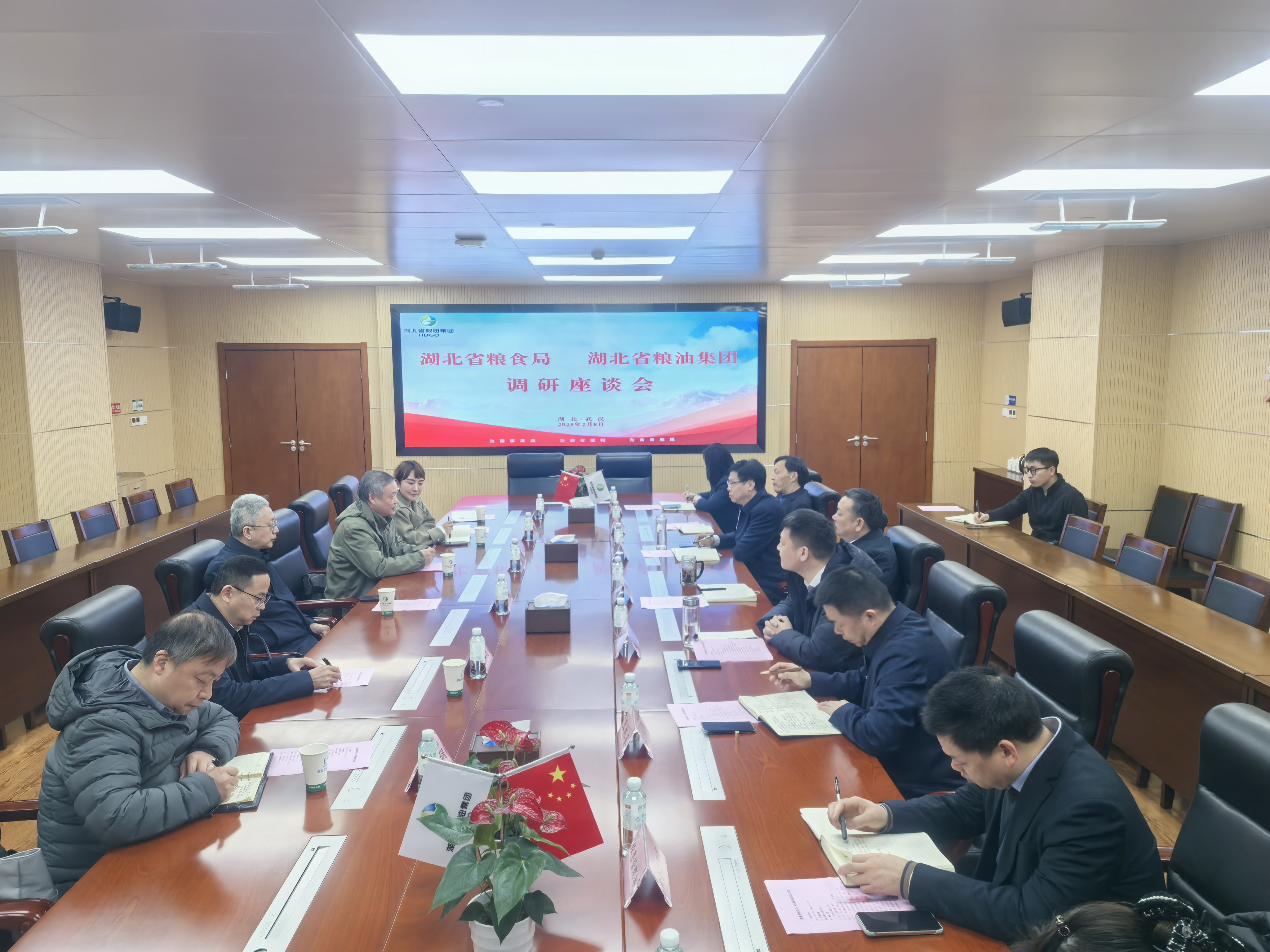 蛇年新春伊始,在全省上下掀起投身支點建設的熱潮中,2月8日,湖北省糧食局負責同志帶領局產業與市場處、湖北糧網一行,專程赴湖北省糧油集團開展新春走訪,向企業致以誠摯的節日問候,并圍繞深化糧食產業經濟發展,做強做優產業鏈建設同省糧油集團黨委書記、董事長紀道斌,黨委副書記、總經理龐虎座談交流。省糧食局對省糧油集團為保障全省糧食安全和產業發展做出貢獻表示感謝,對過去一年的成績給予了充分肯定,表示希望集團繼續發揮省內龍頭及湖北省糧食行業協會會長單位的示范引領作用,在市場體系建設、品牌打造、對外宣傳等方面扛起重任,展現擔當。他強調,當前全省糧食產業正面臨結構升級、科技賦能的新機遇,希望集團充分利用產業政策與國家糧食交易平臺等資源助力發展,在市場開拓、全產業鏈融合等方面與政府部門深化協同,共同守牢糧食安全底線,培育產業發展新動能。省糧食局、湖北糧網都將繼續做好“店小二”,為企業做優做強搞好服務。紀道斌對省糧食局一直以來的指導支持表示感謝,表示集團將堅決貫徹落實省委省政府決策部署和省糧食局工作要求,錨定目標,持續在產業鏈建設、經營質效提升、重點項目落實、優化營銷體系等方面頂壓前行,攻堅克難。將全力支持“荊楚糧油”“江漢大米”“潛江龍蝦”等省域公用品牌的培育和推廣,助力湖北糧油走向全國、走向世界;將積極尋求與湖北糧網合作,實現共贏發展。同時希望省糧食局一如既往的關心支持集團發展,為保障國家糧食安全、推動湖北糧食產業高質量發展作出新的更大貢獻。省糧食局產業與市場處、湖北糧網、省糧油集團、省糧食行業協會相關負責同志參加了座談。